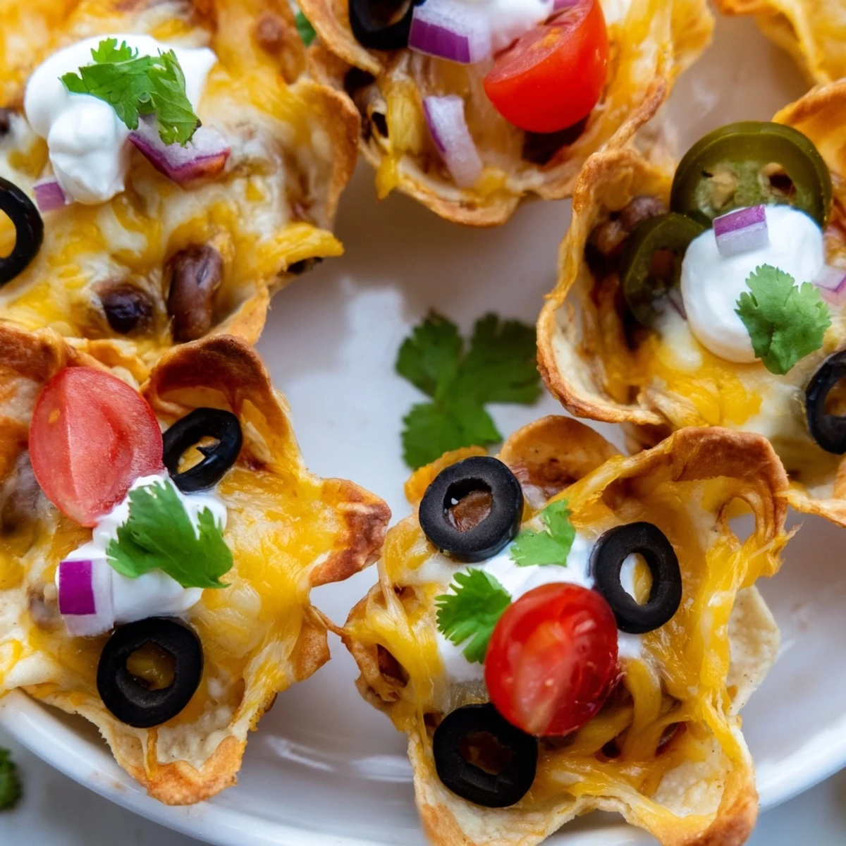 These miniature nacho cups transform classic tortilla chips into handheld vessels for melty cheese and vibrant toppings. Simply arrange scoop-style chips in a mini muffin tin, load them with shredded cheddar and Monterey Jack, then pile on black beans, diced tomatoes, olives, jalapeños, and red onion. Ten minutes in the oven creates perfectly melted, bubbly centers while keeping the tortilla shells satisfyingly crisp. Top with sour cream and fresh cilantro before serving warm alongside salsa or guacamole. Ready in just 25 minutes, these customizable bites make ideal game day fare—add seasoned beef or chicken for heartier versions, or swap in pepper jack for extra heat.
