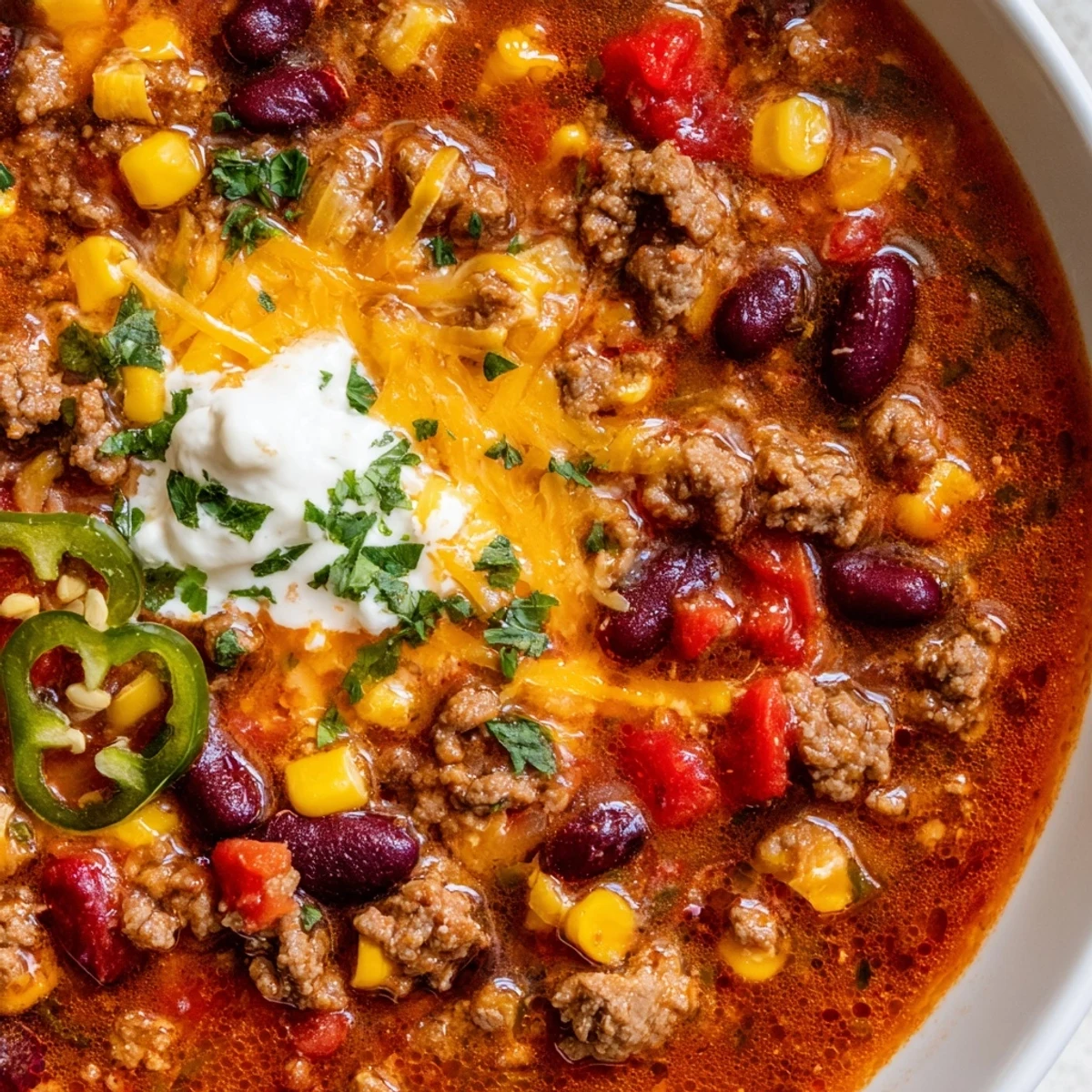 This satisfying taco soup combines browned ground beef with black beans, kidney beans, sweet corn, and diced tomatoes in a rich beef broth seasoned with classic taco spices. The slow cooker method melds the flavors beautifully over six hours, creating a thick, hearty consistency. Top with shredded cheese, sour cream, fresh cilantro, or crunchy tortilla chips for a complete meal that serves six perfectly.