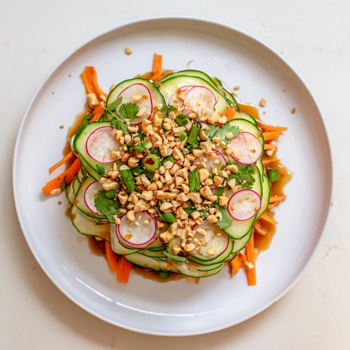 This vibrant bowl brings together crisp cucumbers, julienned carrots, and thinly sliced radishes for maximum texture. The tangy sesame dressing, infused with fresh ginger and garlic, coats every vegetable perfectly. Ready in just 15 minutes with no cooking required, this light side balances refreshing crunch with savory Asian-inspired flavors. Toasted peanuts and sesame seeds add satisfying nuttiness, while fresh cilantro provides bright herbal notes. Perfect alongside grilled proteins or as part of a light lunch spread.