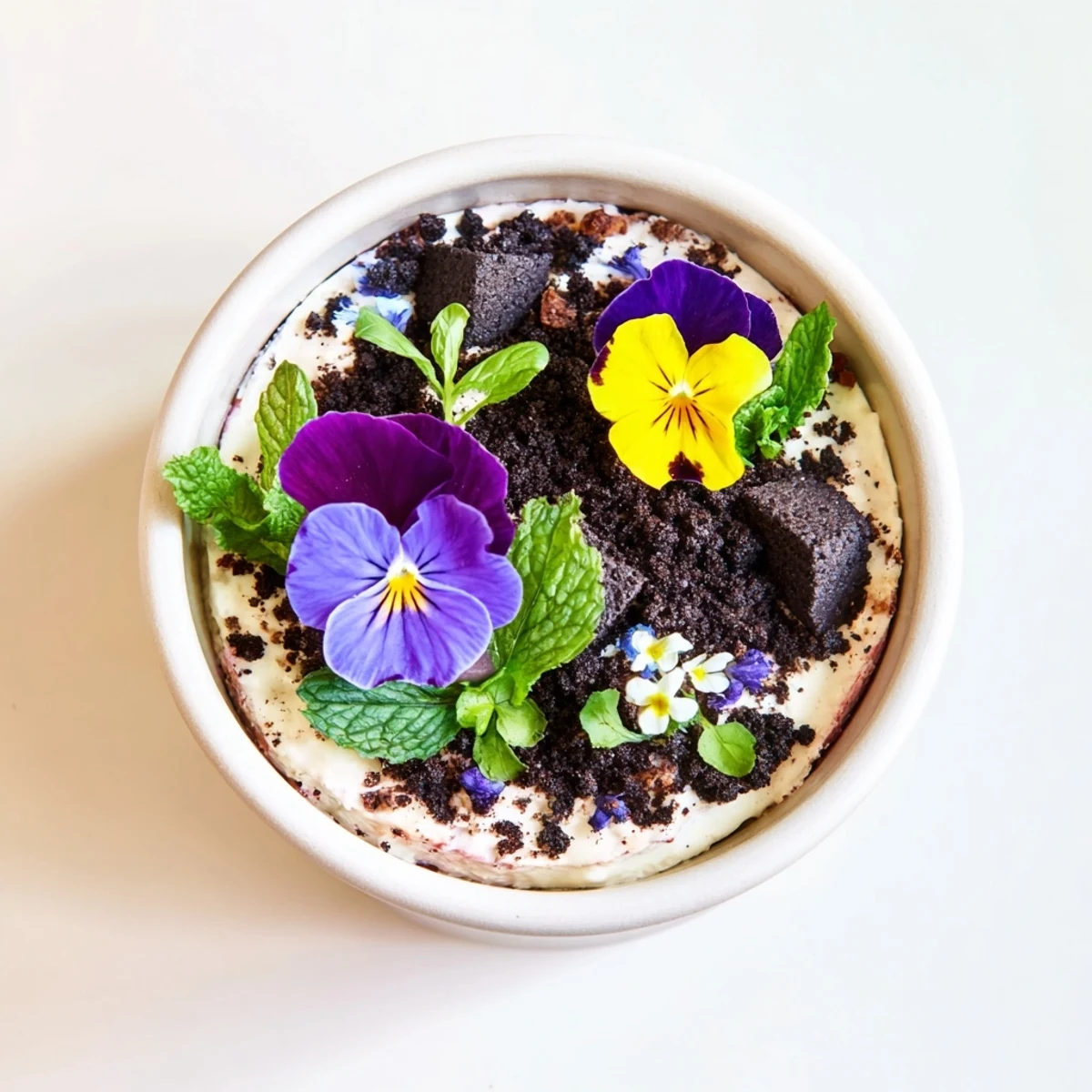 - Arrange edible flowers mint leaves and fresh herbs into the cookie crumb soil. Tuck them in like youre actually gardening creating little clusters that look natural and wild. Chill everything for at least 30 minutes so the flavors meld together.