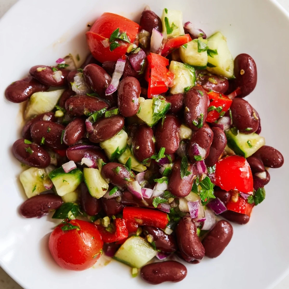 I brought this salad to a potluck last fall, watching my friend Sarah take a tentative spoonful before her eyes actually widened. She'd been skeptical about bean salad, probably remembering those sad, mushy versions from potlucks past, but this was different. The crunch of bell pepper and cucumber against the creamy beans, that sharp vinaigrette cutting through everything, and she went back for seconds before I'd even sat down with my own plate.